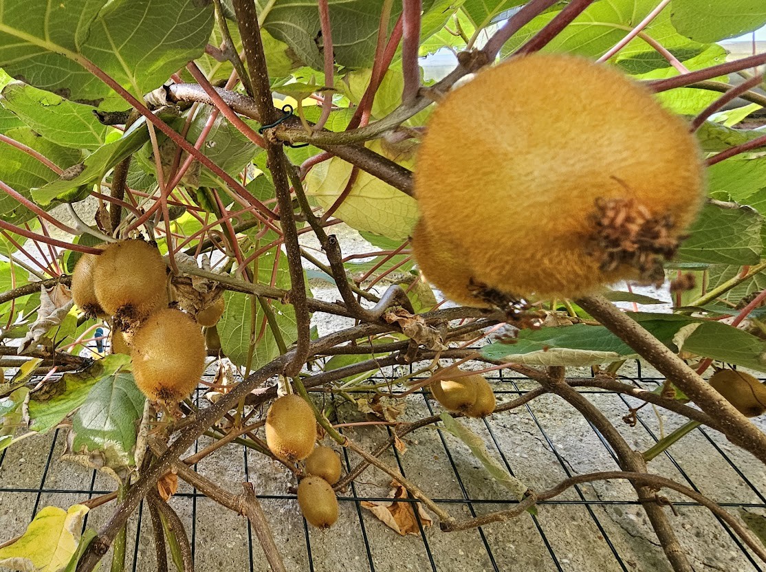 Na slunné stěně dílny vedle výběhu hus si můžete všimnout bujné liánovité rostliny – kiwi. Díky teplé zdi a závětří se jí zde velmi daří. Na výsadbě jsou dva typy kiwi – maloplodé a velkoplodé. Oba druhy potřebují samčí i samičí rostlinu pro opylení.