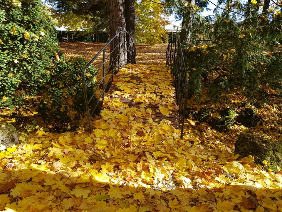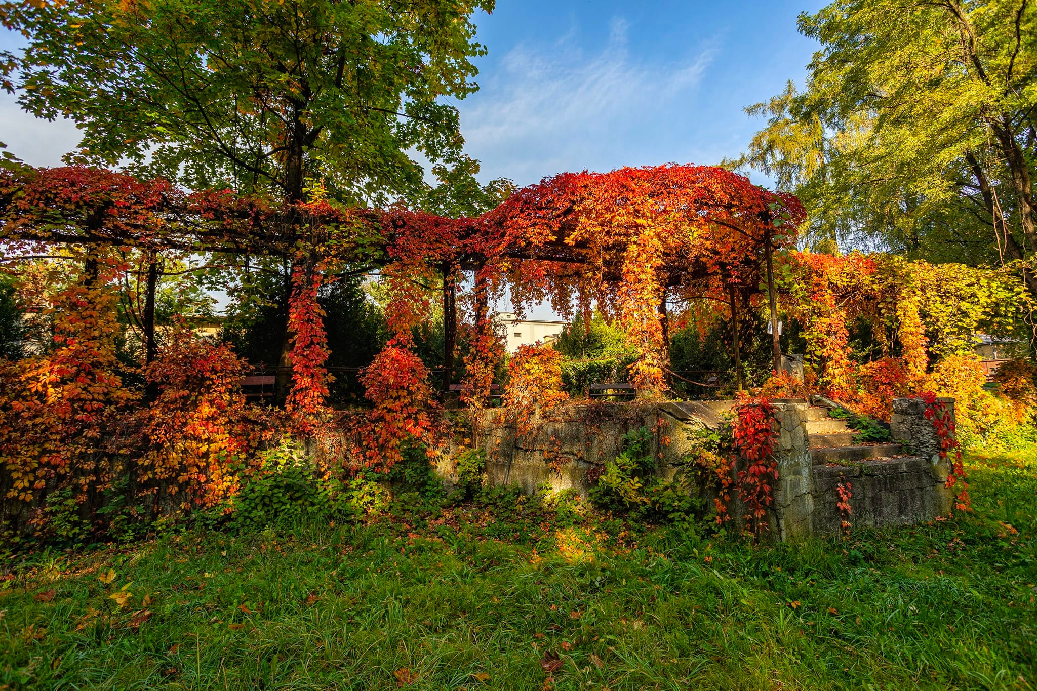Na podzim je však pergola nejkrásnější – listy hrají všemi odstíny červené, oranžové a zlaté. Sluneční paprsky procházející barevným listím dodávají místu výjimečné kouzlo a vytvářejí kulisu, která je sama o sobě slavnostní.